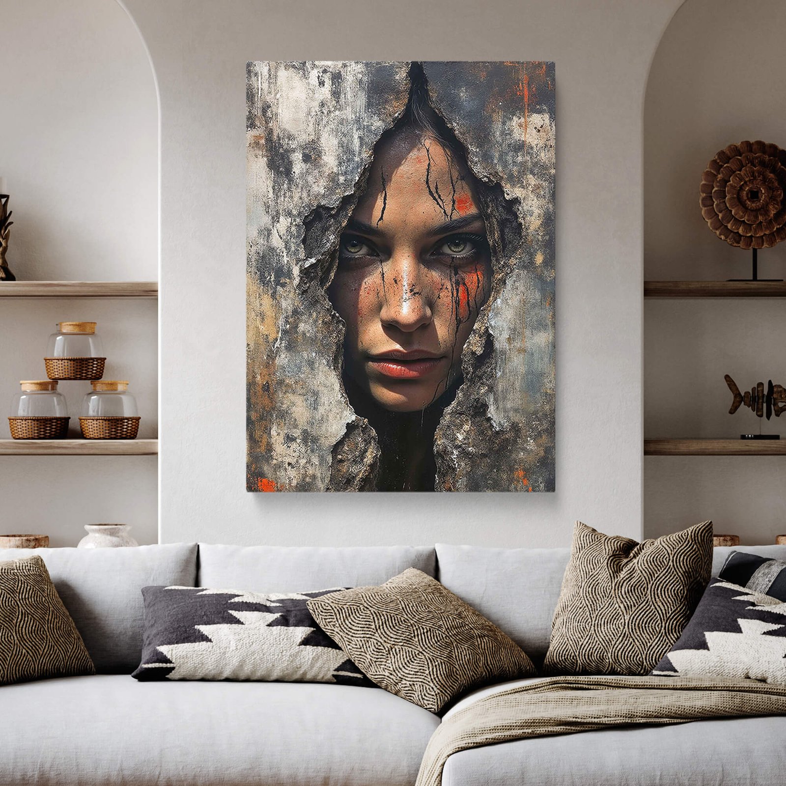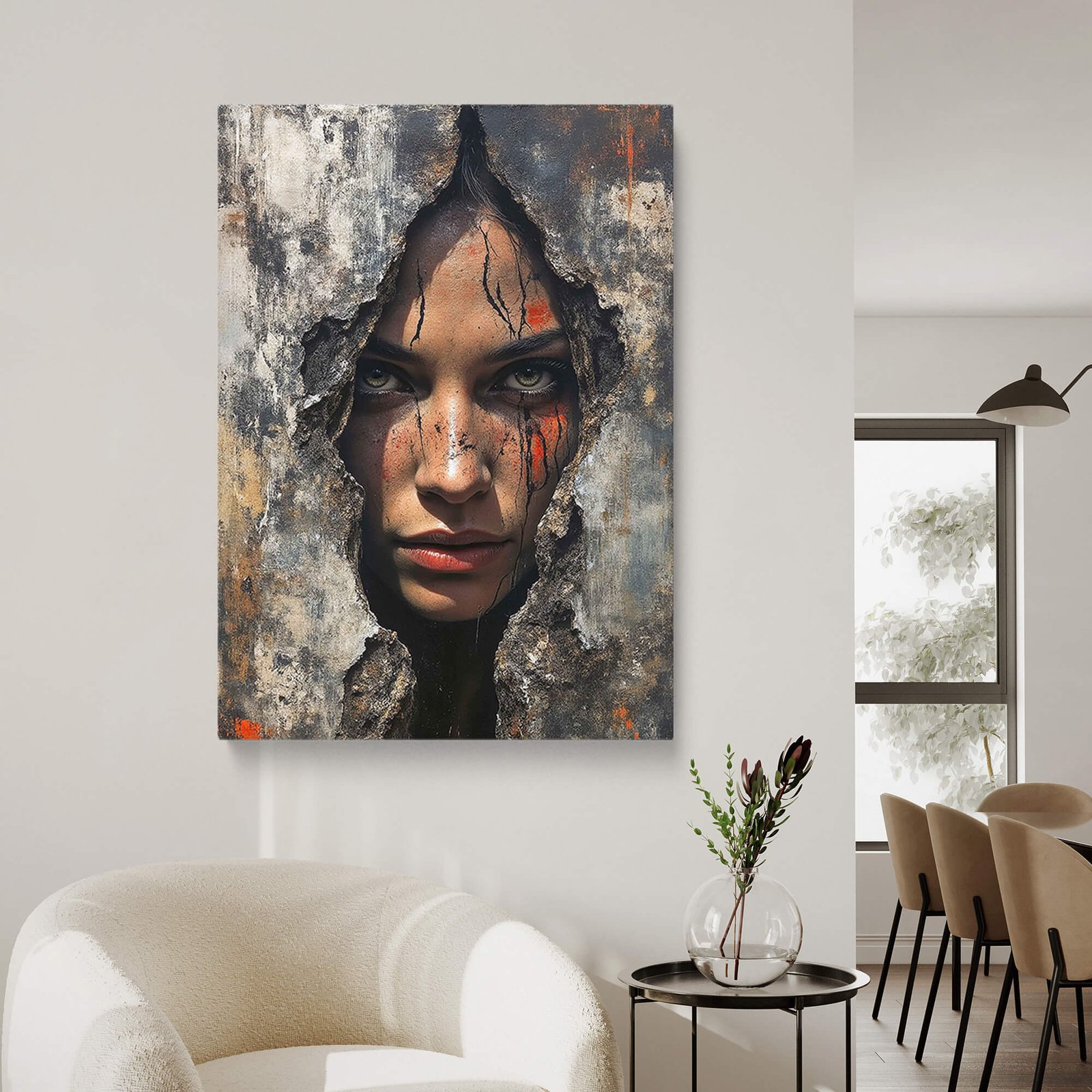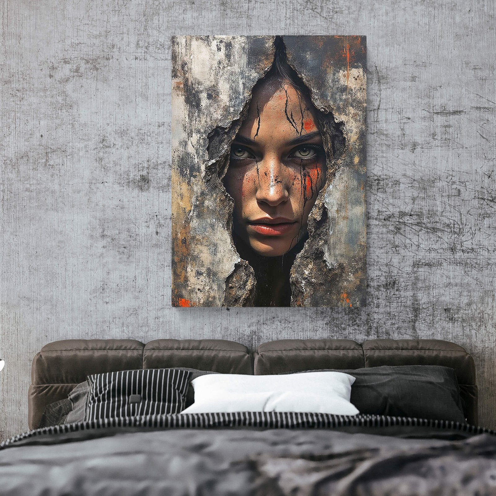 The artwork features a Dramatic Woman’s Face peering intensely through a tear in what appears to be a heavily textured, dilapidated wall. The predominant palette of Black and Grey enhances the dark, visceral mood, while the subtle hints of colourโlike the striking red accents near the eyes and lipsโadd a layer of intense emotion and raw energy. The high-resolution print meticulously captures the Grunge Texture of the faux-cracked concrete and plaster, making the figure seem like a defiant vision emerging from the chaos.