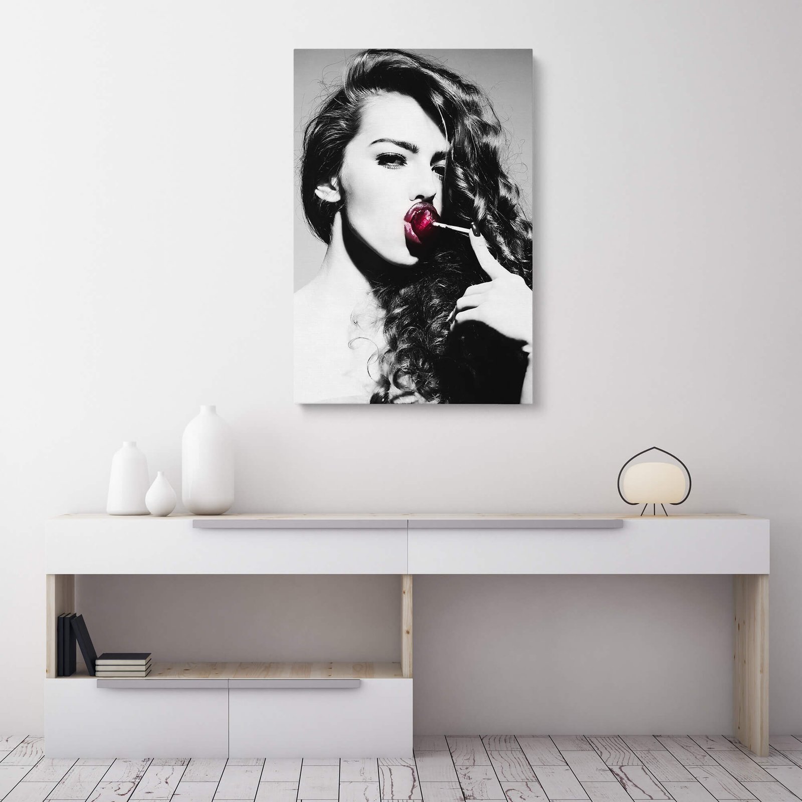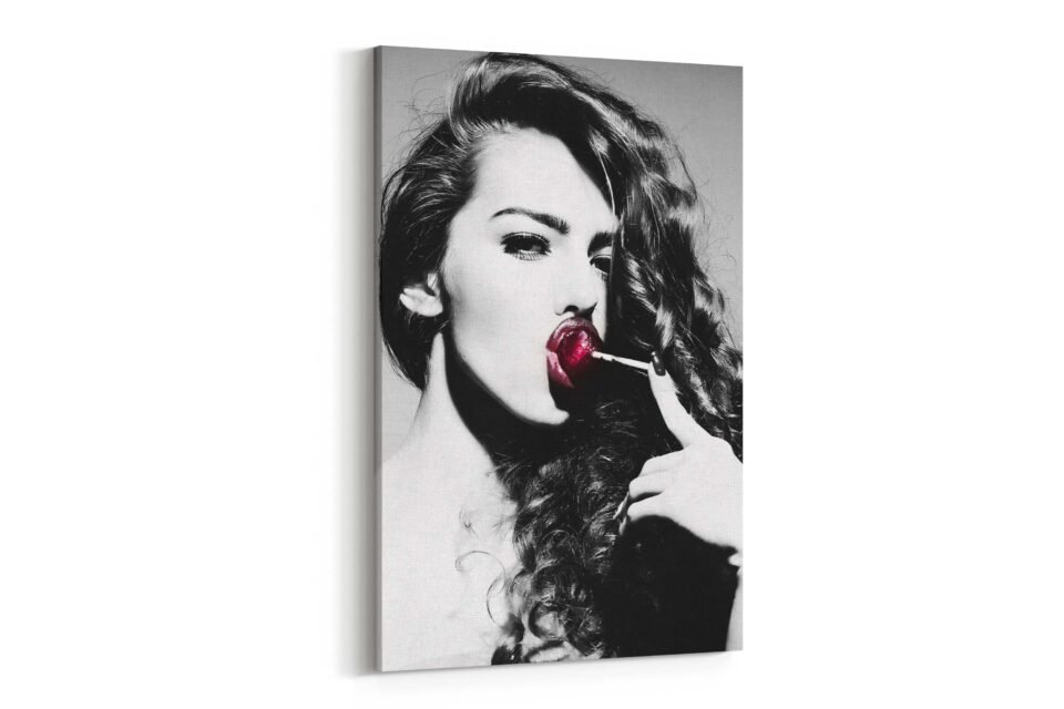 Lollipop Seduction – Black and White Portrait with a Woman and a Red Temptation – Canvas Prints
