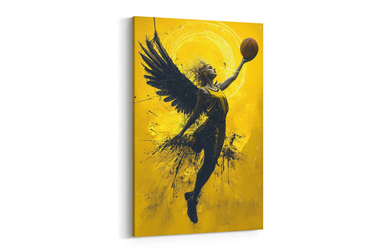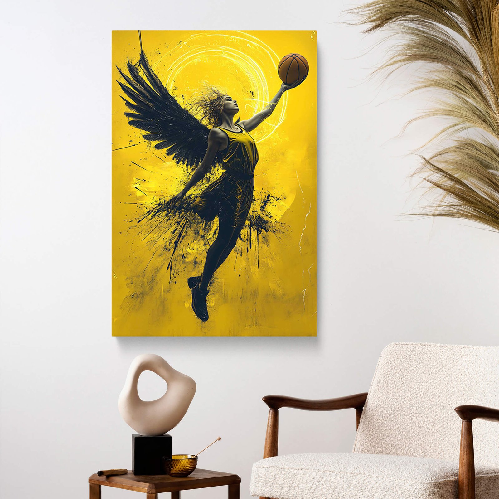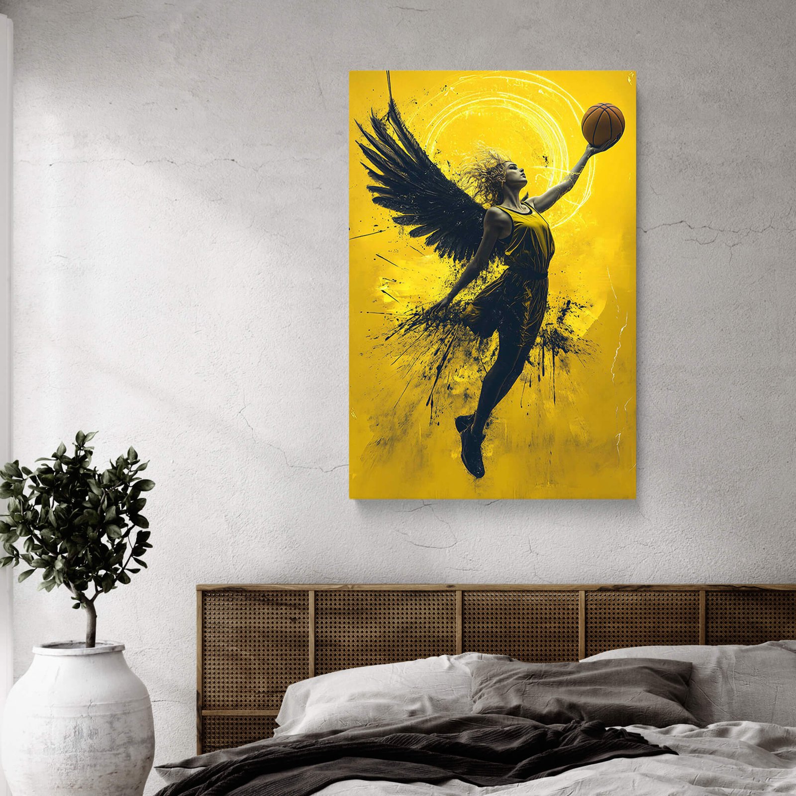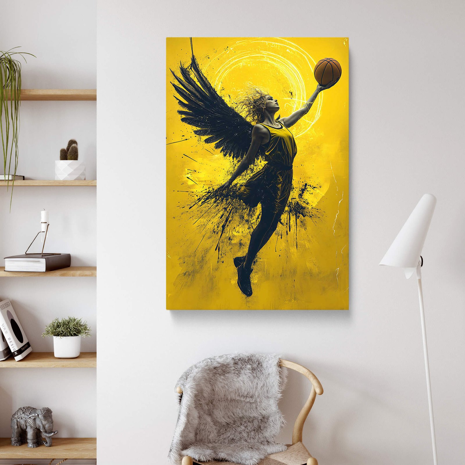 Dunking Angel –ย Canvas Print, Basketball Art in Yellow and Black, Dynamic Sports Wall Decor