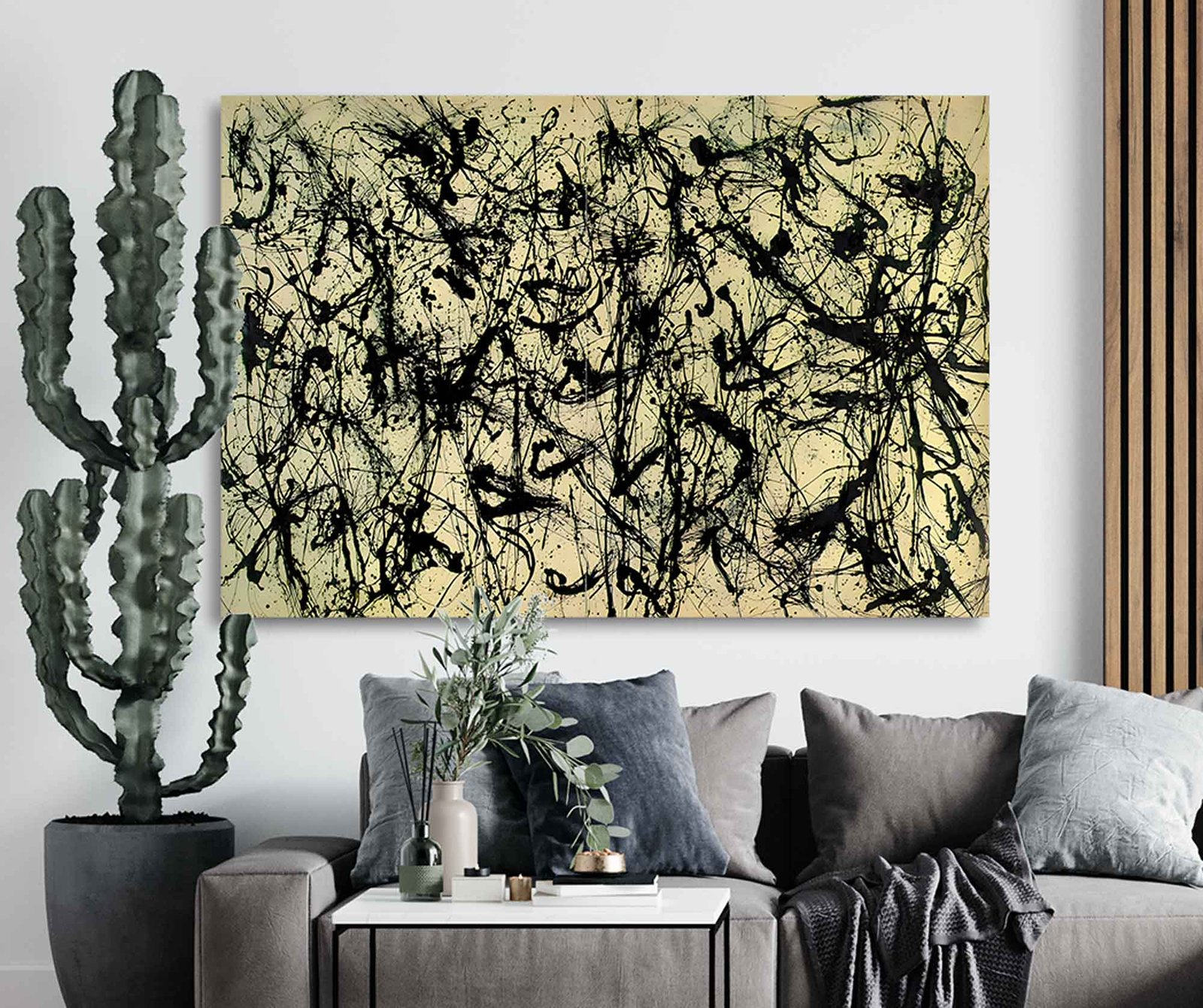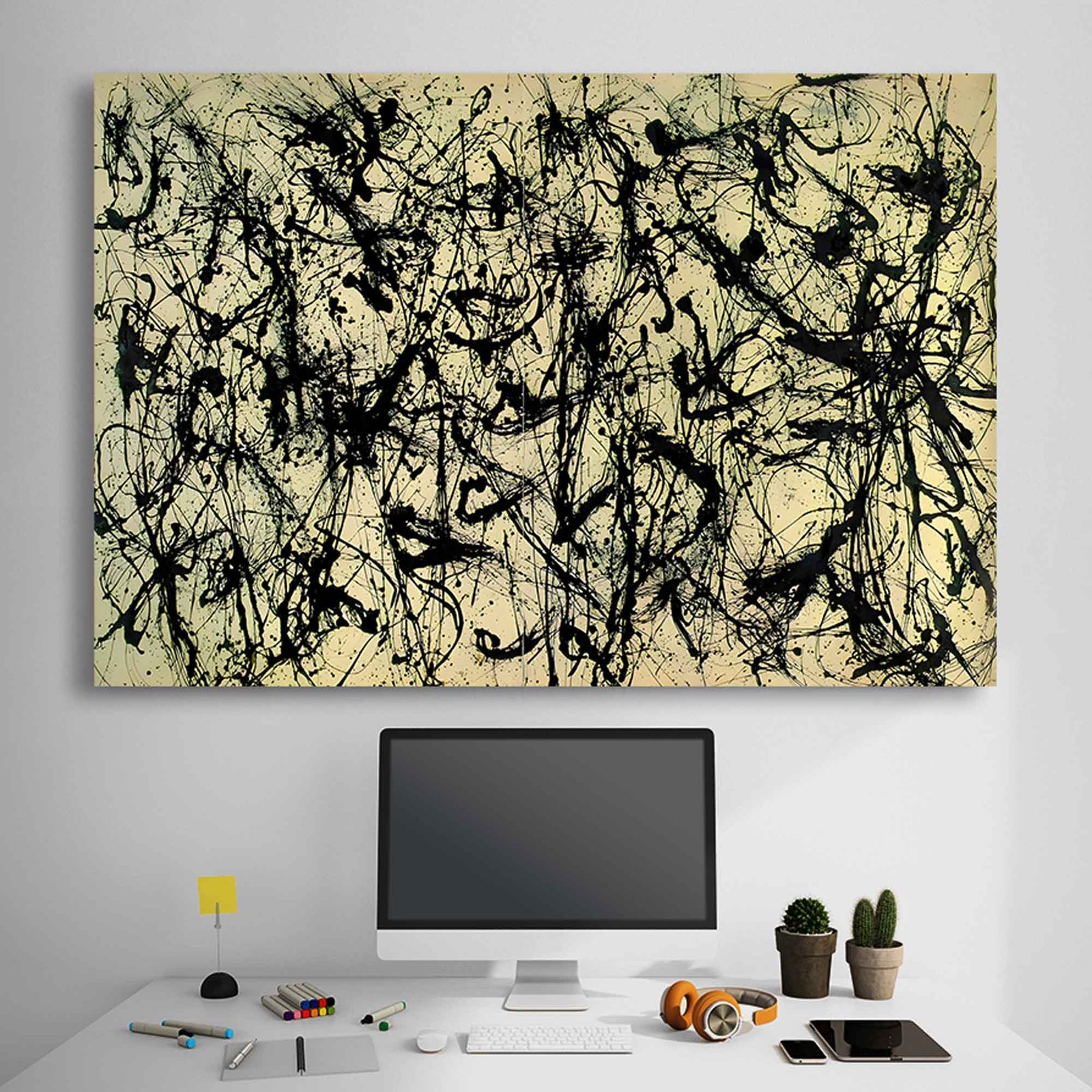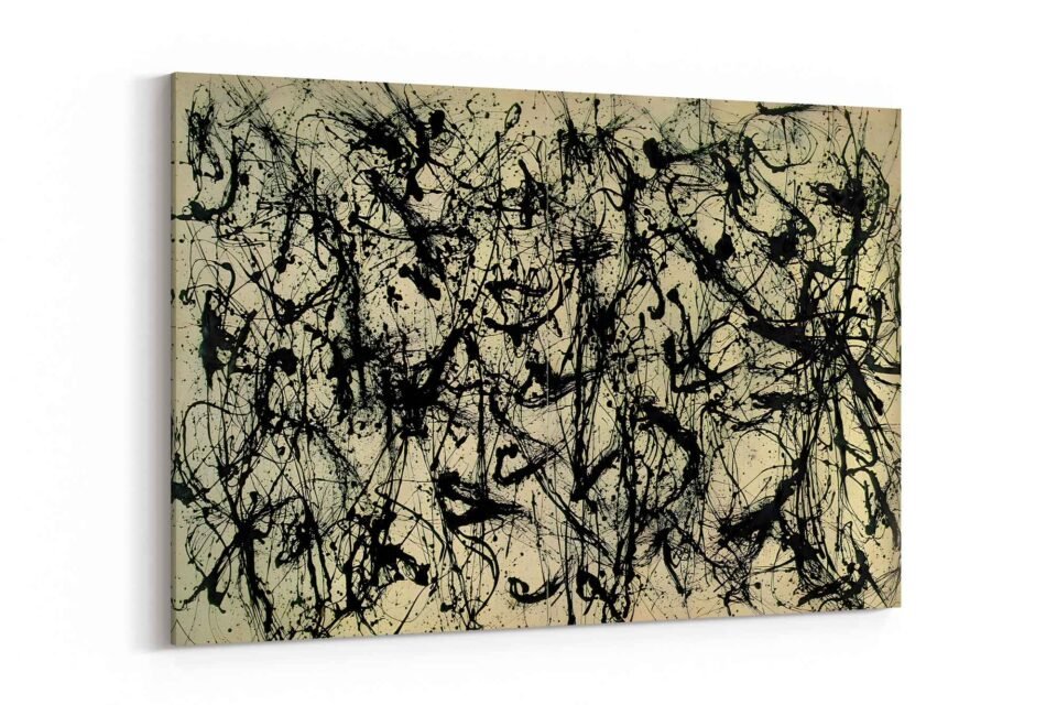 Experience the unfiltered energy and stark beauty of Pollock’s iconic abstract expressionism, where pure black enamel paint creates a powerful visual symphony. This compelling piece is a direct homage to Pollock’s revolutionary “black pourings” from the late 1940s and early 1950s, a period where he stripped down his palette to focus on the expressive potential of line and spontaneous action.