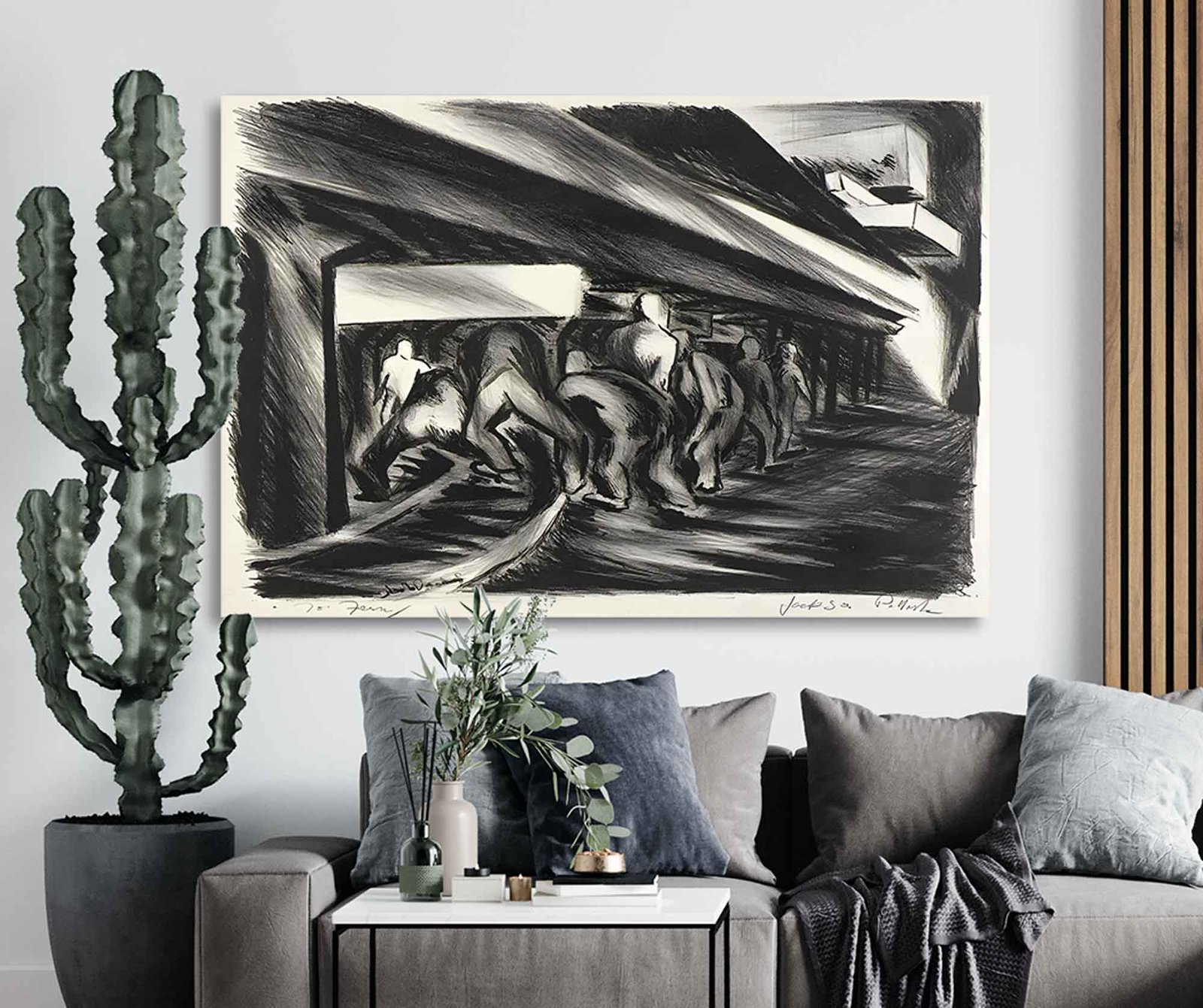This unique abstract artwork draws inspiration from Pollock’s early, more figurative works and his profound connection to American labor themes, reinterpreted through a dynamic, energetic lens that hints at his later abstract style. It’s a striking piece that captures a sense of toil, strength, and the depth of the earth.