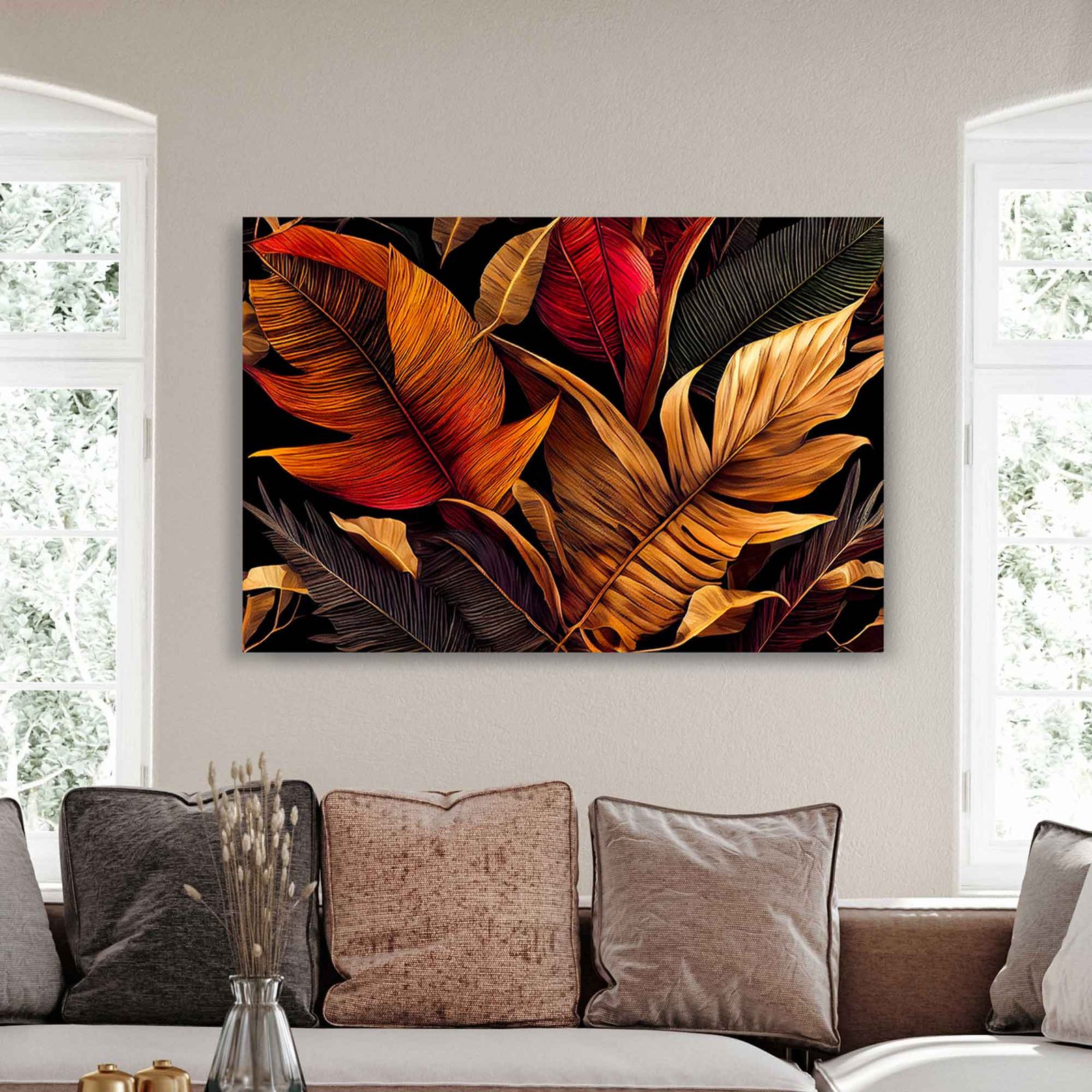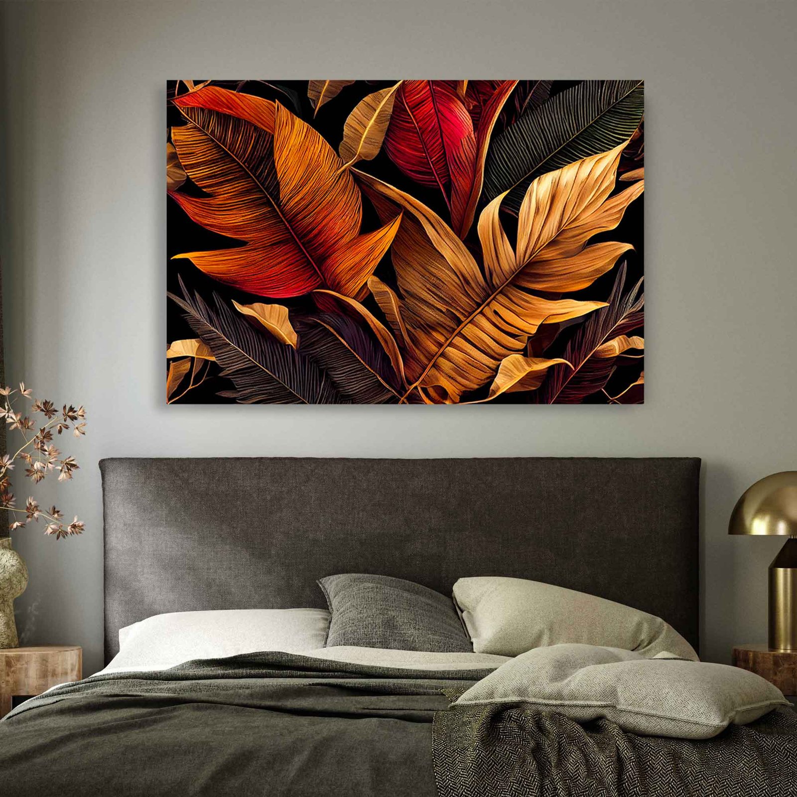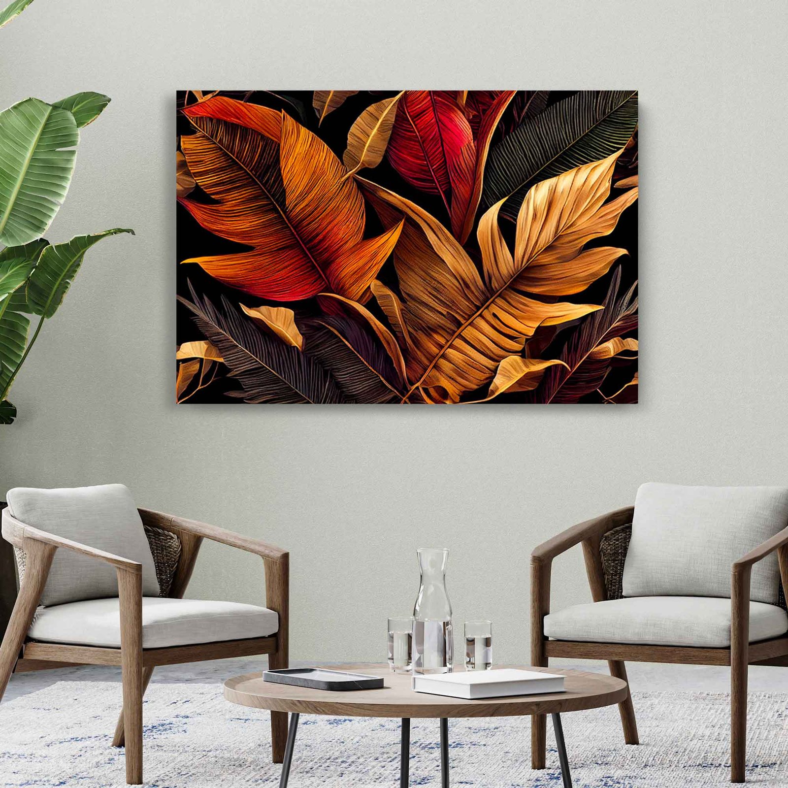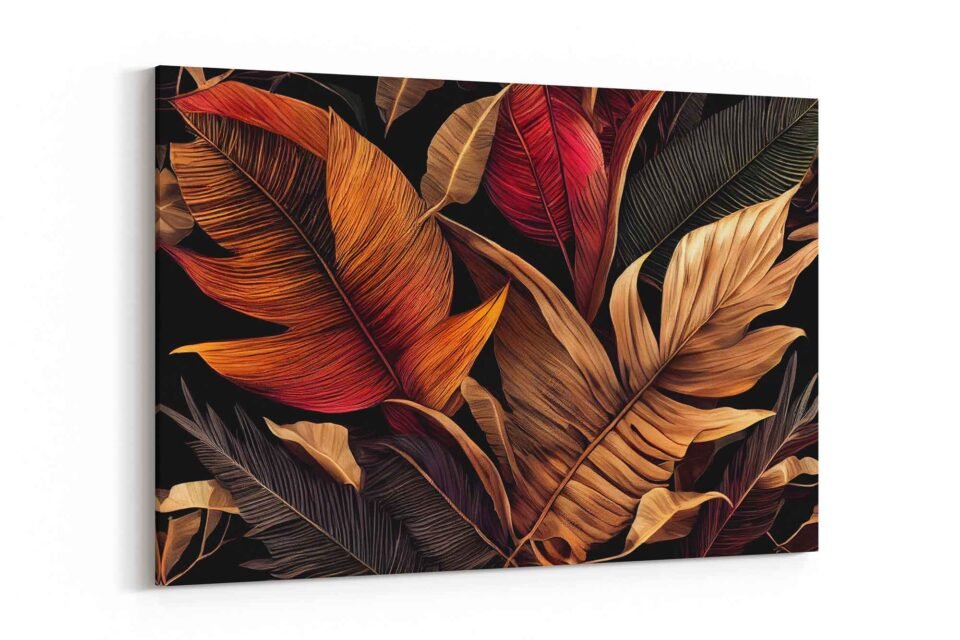 This stunning botanical art print features a rich, abstract interpretation of lush leaves, rendered in a mesmerizing palette of warm tones. It’s a sophisticated and vibrant piece designed to infuse your home decor with a touch of nature-inspired elegance and dramatic allure.