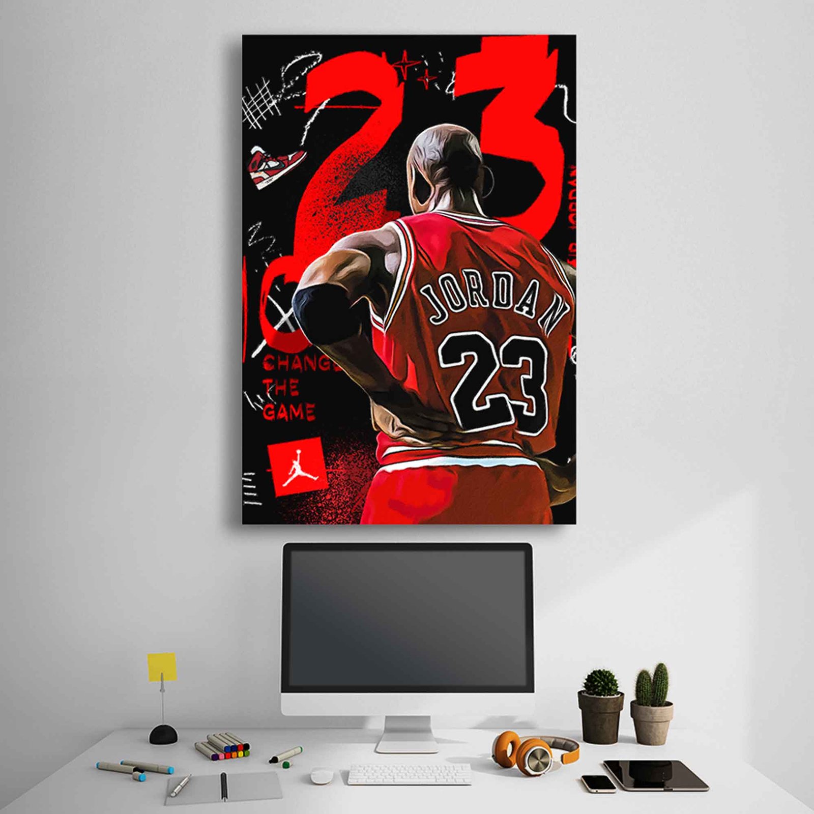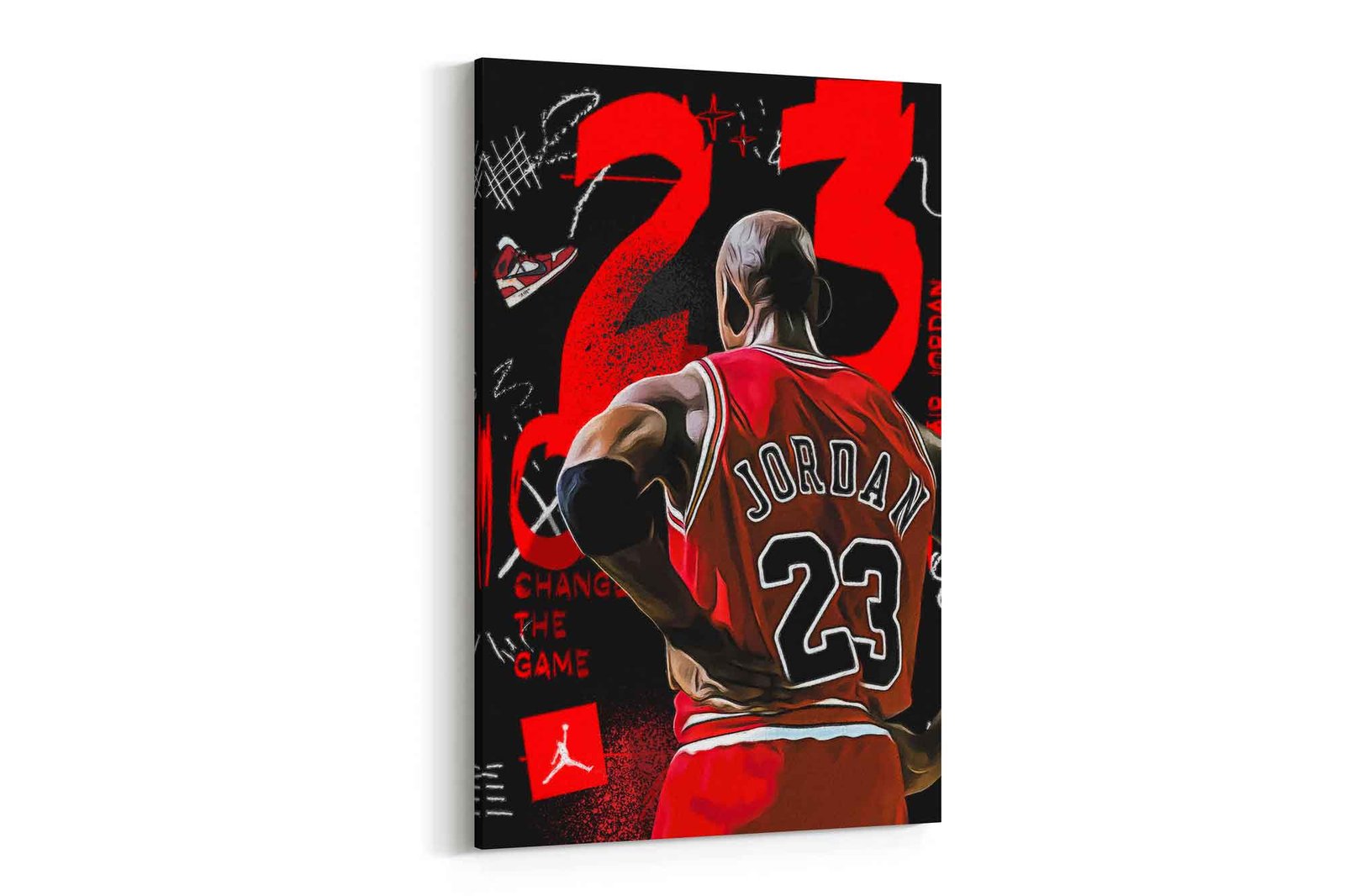 This captivating canvas print features a dynamic, street-art inspired depiction of Michael Jordan, capturing his legendary presence and the intensity that defined his career. The artwork is alive with vibrant colors and raw, expressive graffiti elements, including bold splashes, drips, and stylized text that give it an authentic urban aesthetic. The powerful “CHANGE THE GAME” quote is prominently integrated into the design, serving as a daily reminder of Jordan’s revolutionary impact on basketball and the world. It’s a perfect fusion of sports history, iconic imagery, and rebellious street art, designed to inspire, motivate, and impress.