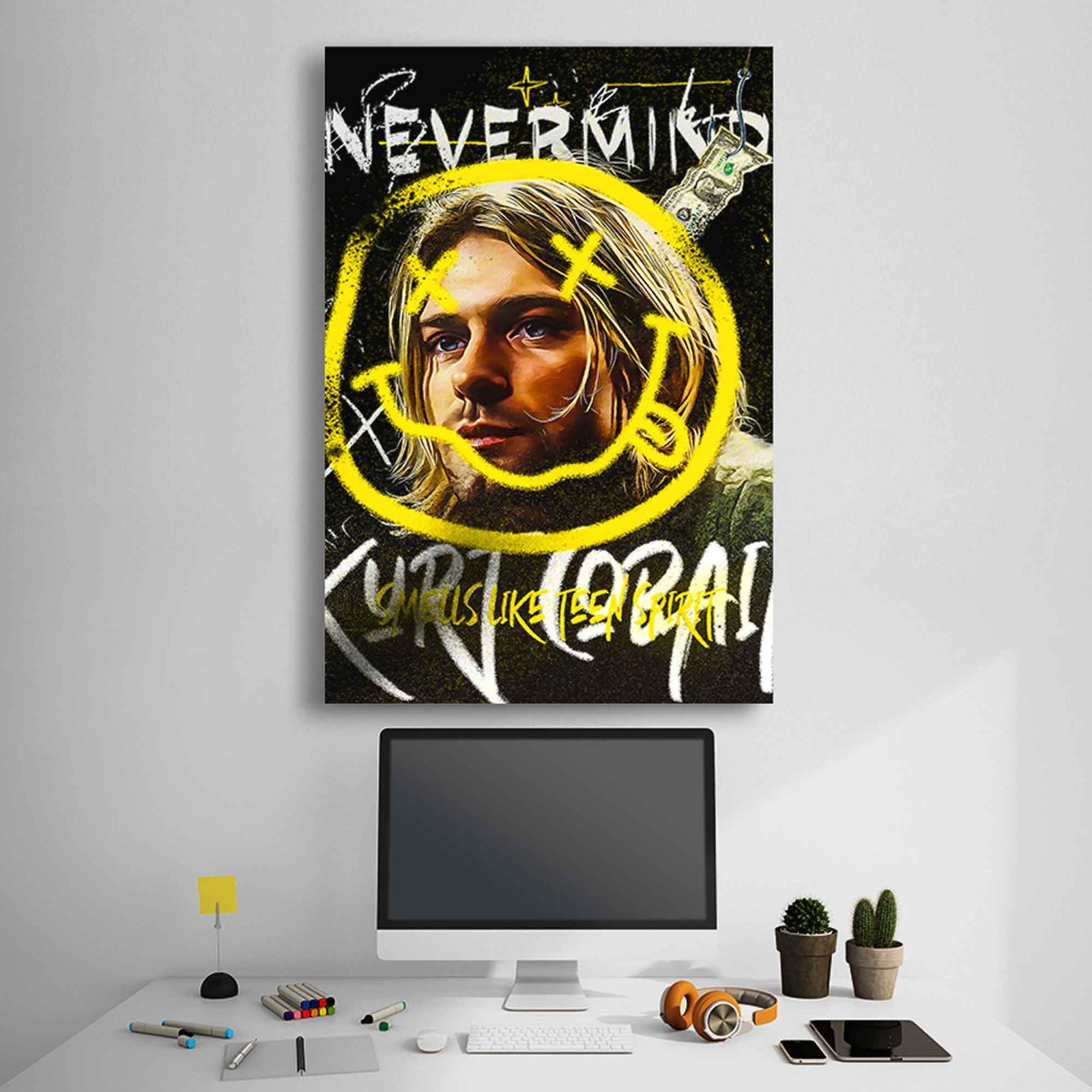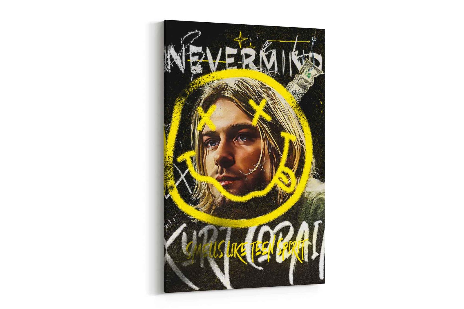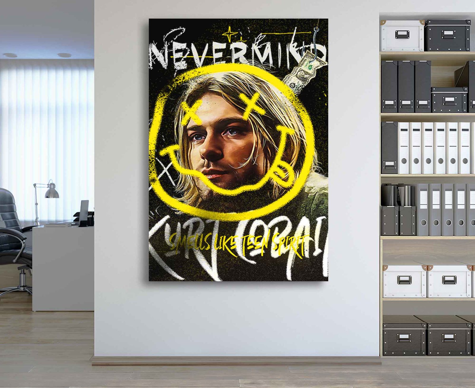 This captivating canvas print features a dynamic, street-art inspired depiction of Kurt Cobain, capturing his intense presence and the defiant spirit that defined the grunge movement. The artwork explodes with vibrant colors and raw, expressive graffiti elements, including bold splashes, drips, and stylized text that give it an authentic urban edge. Central to the design are the iconic Nirvana smiley face logo and a reference to the legendary “Nevermind” album, serving as a powerful visual tribute to the band’s groundbreaking sound and cultural impact. This isn’t just a print; it’s a visual symphony that embodies the chaos, honesty, and revolutionary spirit of grunge rock, perfect for inspiring creativity and sparking a sense of nostalgia.
