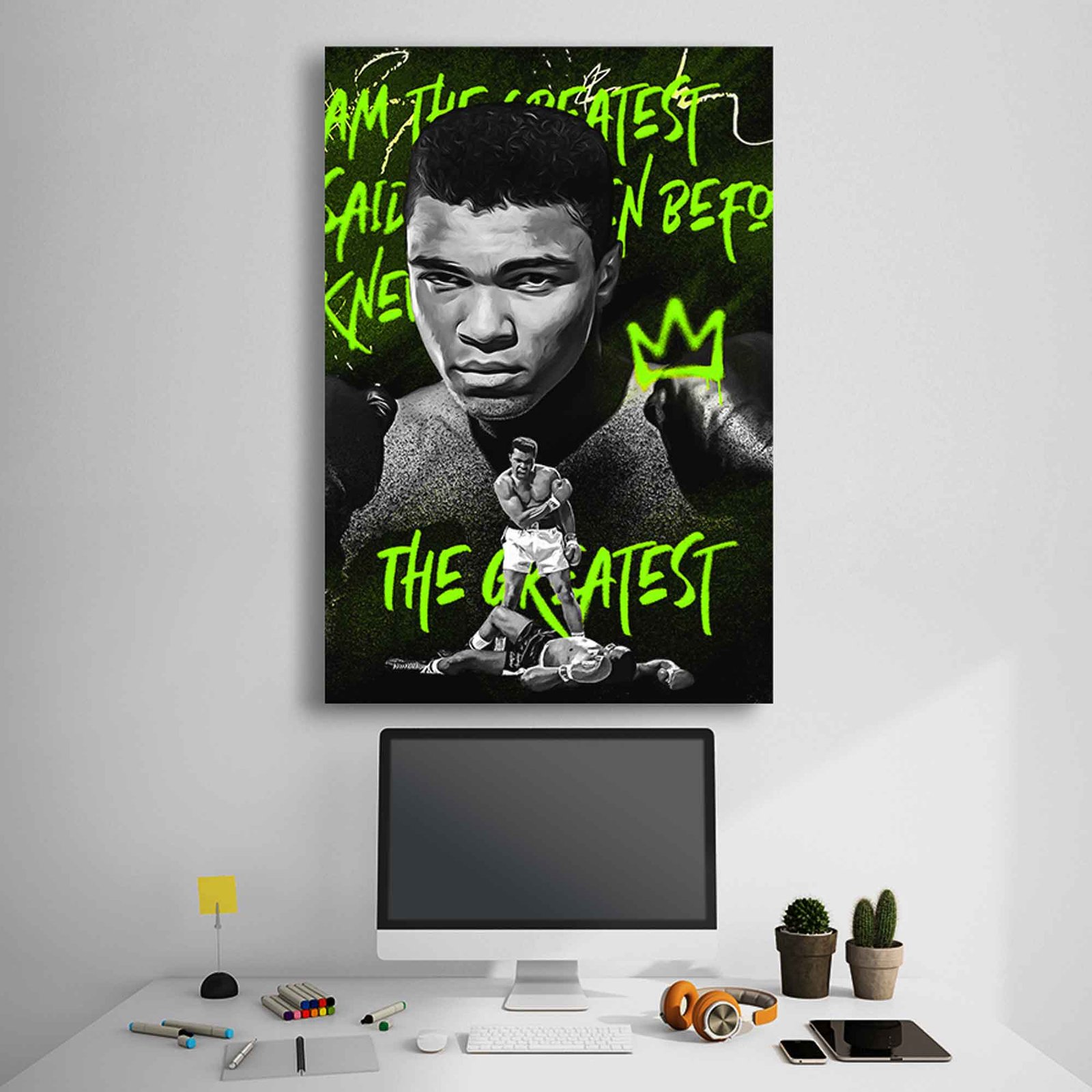 This captivating canvas print features a dynamic, street-art inspired depiction of Muhammad Ali, capturing his fierce presence and legendary fighting pose. The artwork explodes with vibrant neon green street art elements, including bold splashes, drips, and abstract textures that give it an authentic urban edge. Central to the design is Ali’s iconic, self-proclaimed mantra, “I AM THE GREATEST,” integrated as a powerful graffiti print. This isn’t just a portrait; it’s a visual celebration of Ali’s profound impact on sports and culture, blending his legendary status with the raw, rebellious energy of modern street art. It’s the perfect statement piece for any fan who wants to infuse their space with the spirit of a champion.