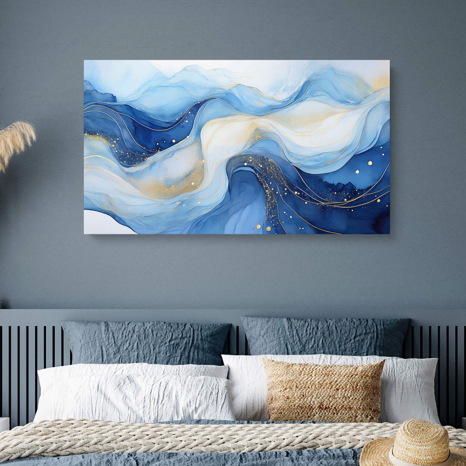 Featuring dynamic swirls and seamless gradients of Navy blue, deep indigo, cerulean, and soft white, the artwork mimics the ebb and flow of a calming tide. The composition is dramatically accented with striking Gold flakes and veins, giving the art the luxurious look of an Agate Geode or natural mineral deposit. These metallic details catch the light beautifully, adding a high-end, shimmering finish.