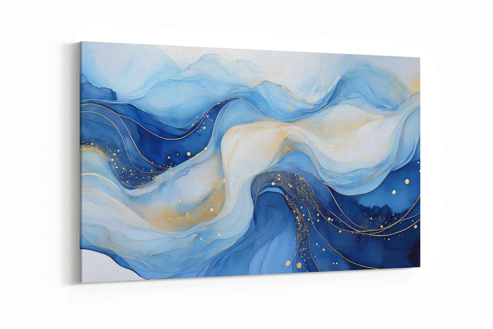 Coastal Blue Marble Flow Canvas Art Print, White and Indigo Abstract Art on Canvas Print, Gold Shimmer Mineral Decor