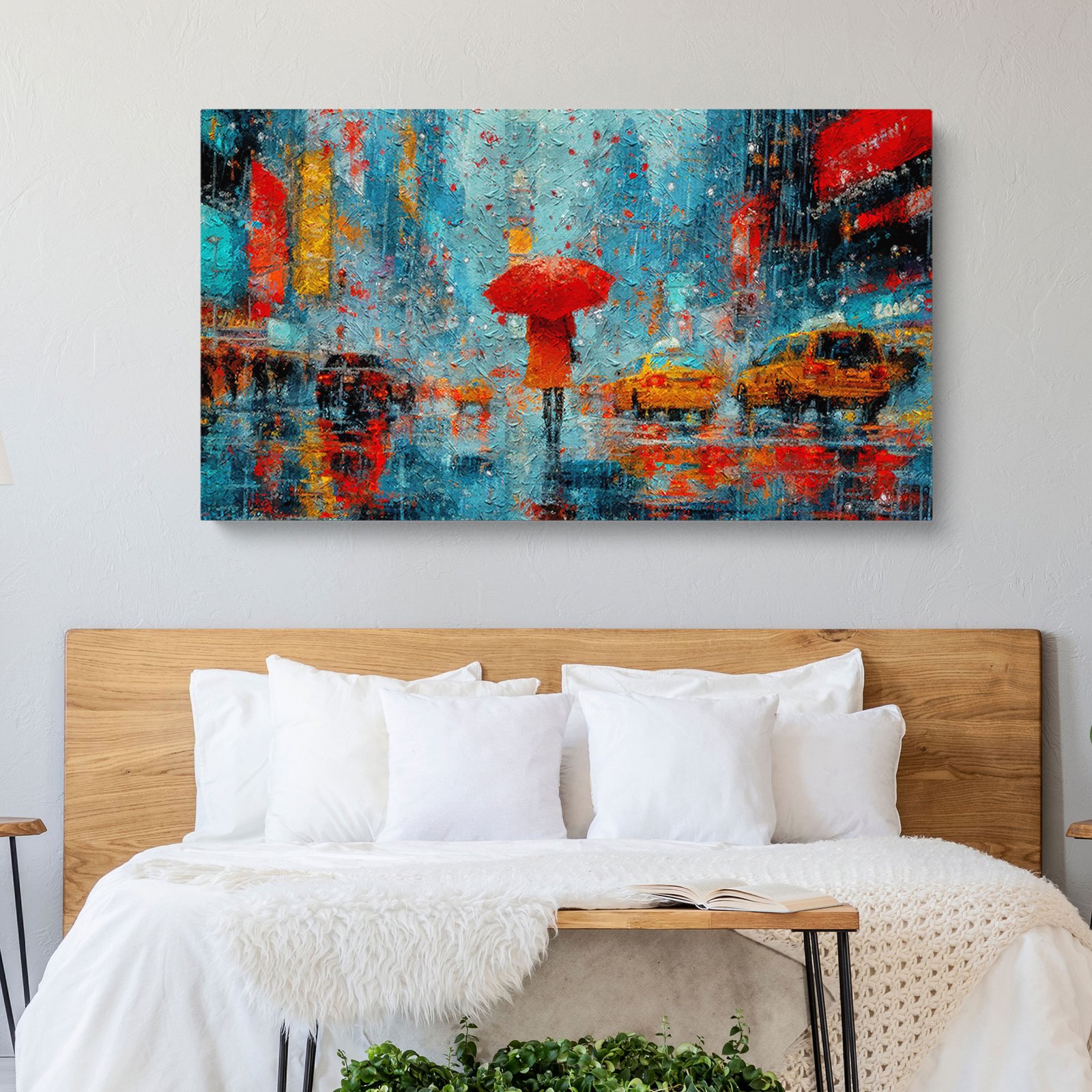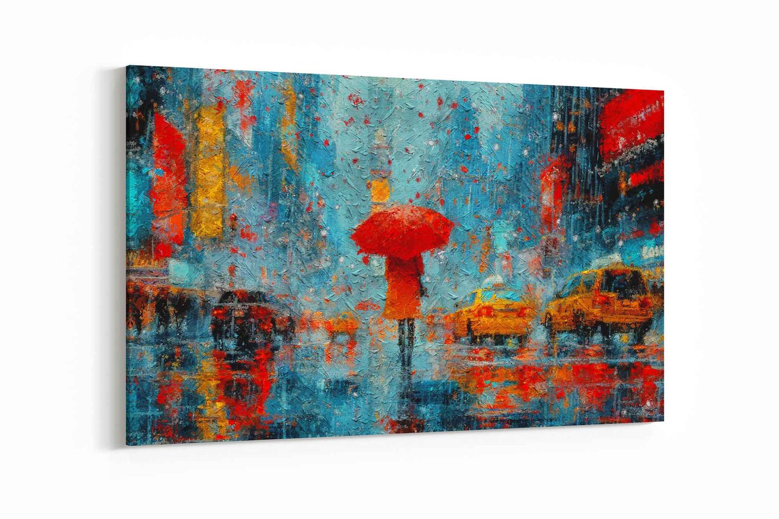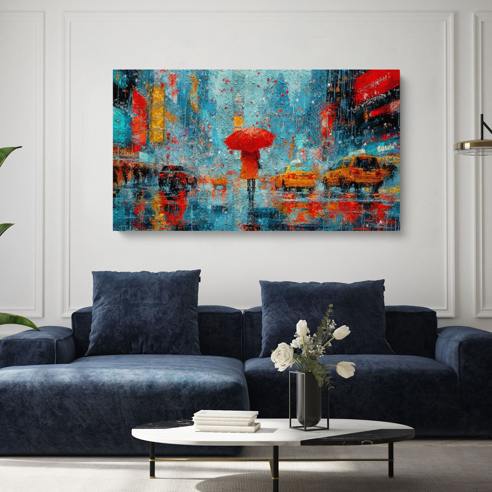 Enhance your space with this large abstract cityscape wall art, featuring a vibrant rainy street scene with a striking red umbrella and yellow taxis. A modern urban art print, perfect for adding a dynamic touch to your home or office dรฉcor.