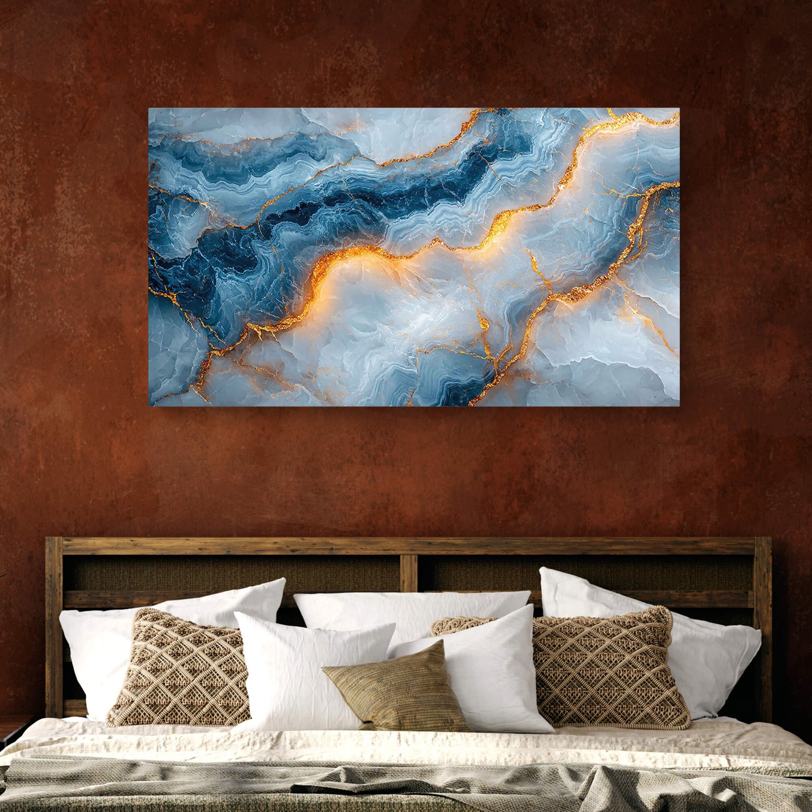 Infuse your home with the dramatic power of the ocean with the Stormy Blue and Gold canvas print. This piece of Abstract Art captures the energy and depth of a turbulent sea, rendered with the luxurious look of Ocean Marble and crystalline geodes.