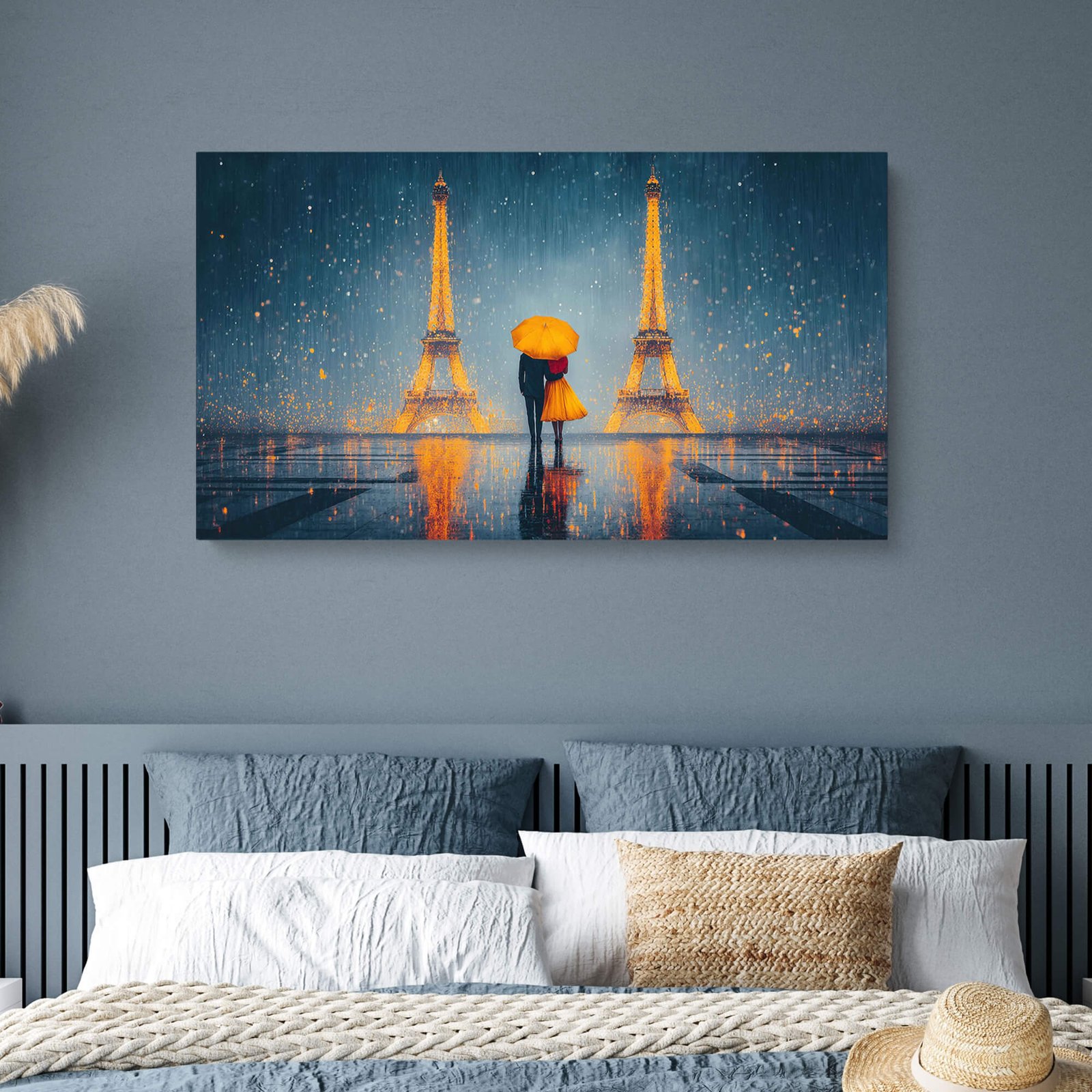 Eiffel Tower Romance –ย Canvas Print, Couple Under Yellow Umbrella Art, Rainy Paris Love Wall Decor