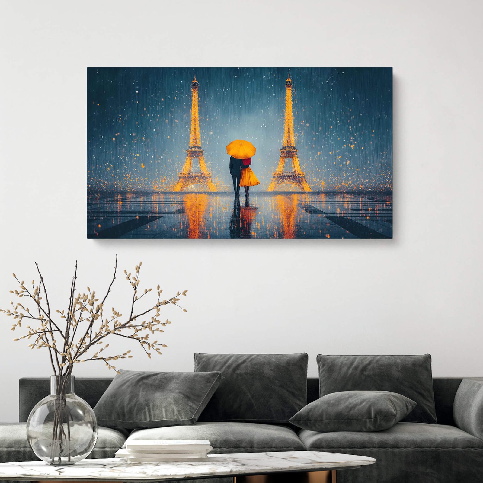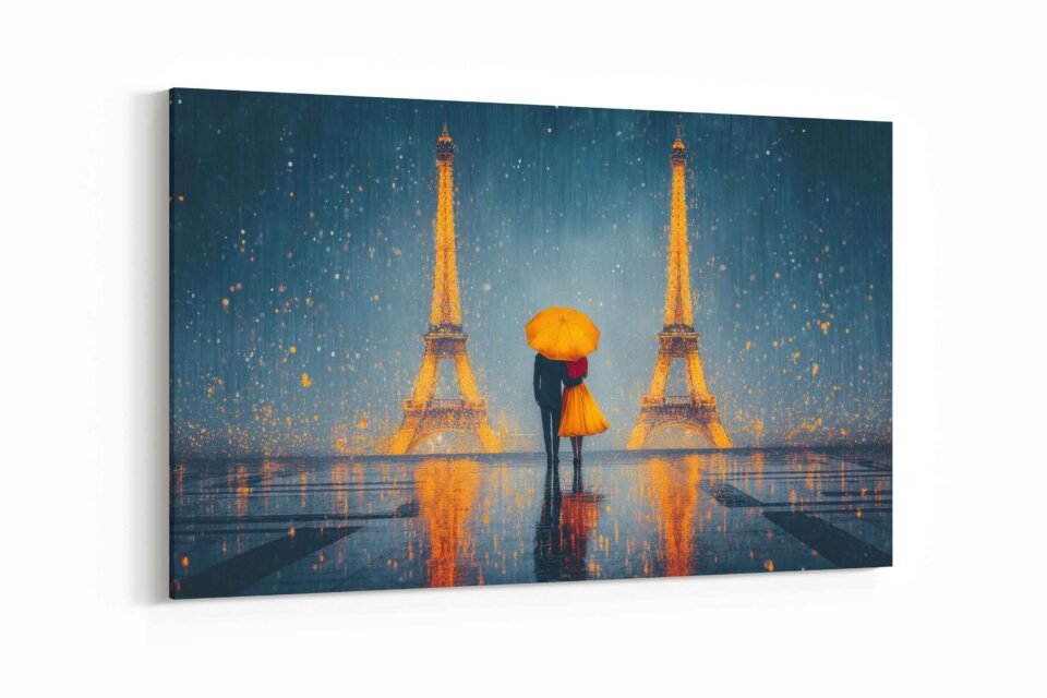 Step into a moment of timeless, cinematic romance with our Golden Rain in Paris canvas print. This stunning piece captures the magic of the “City of Love” under a shimmering, rain-swept sky, making it an unforgettable focal point for any room.