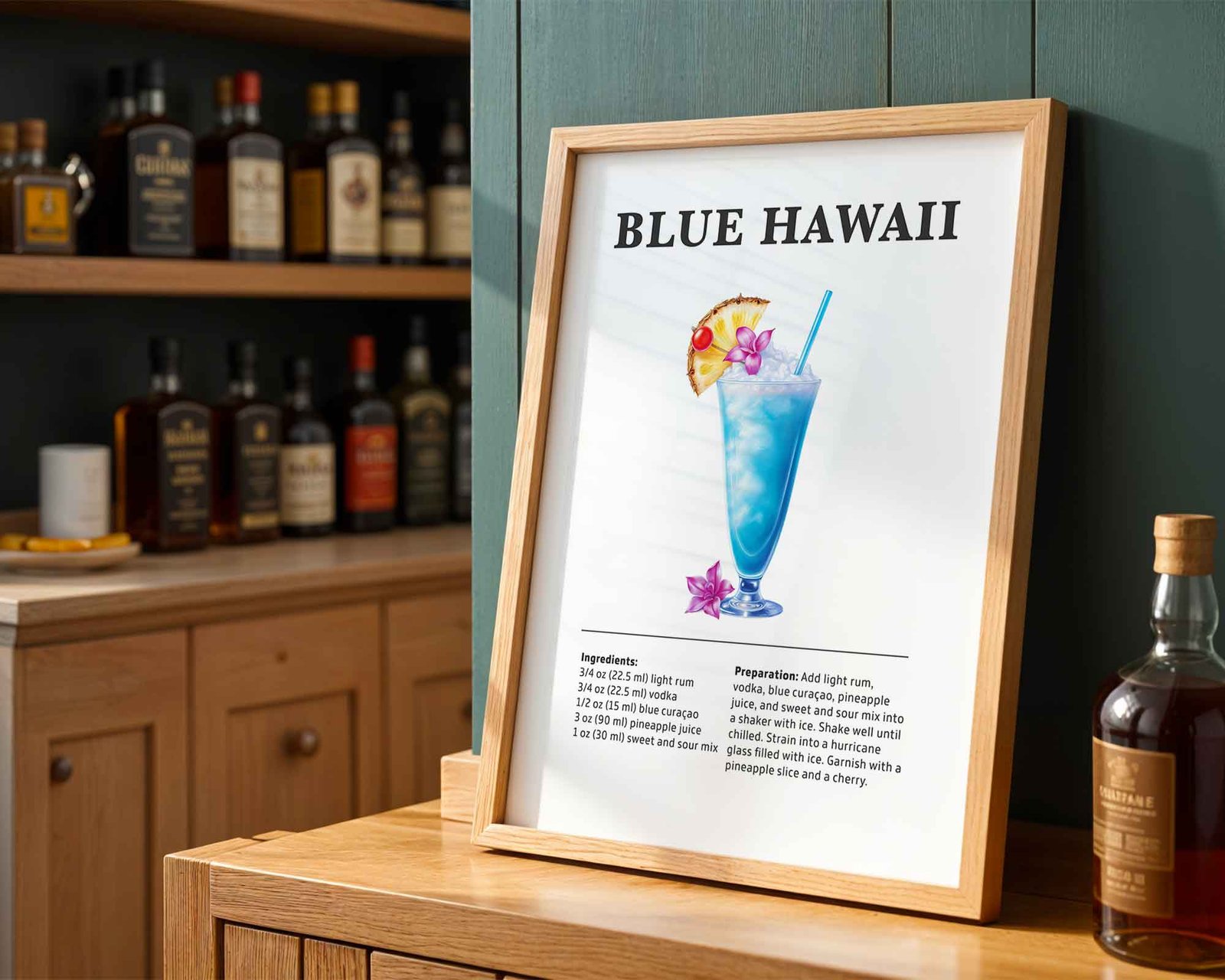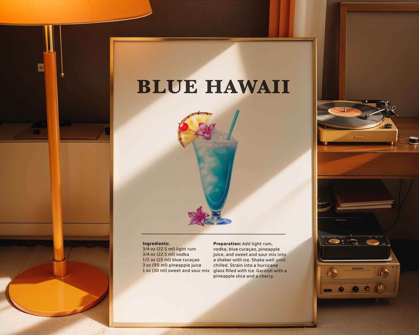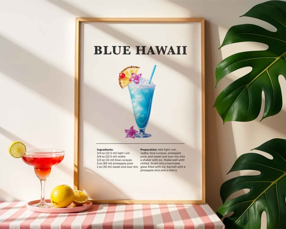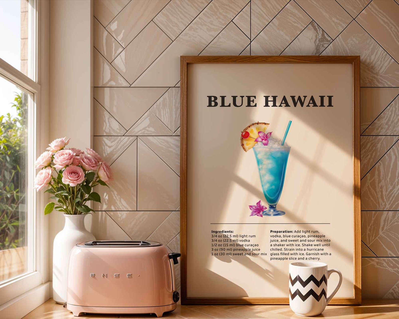 Minimalist Blue Hawaii Poster Print | Illustrated Cocktail Recipe Print | Modern Kitchen and Bar Wall Art Prints