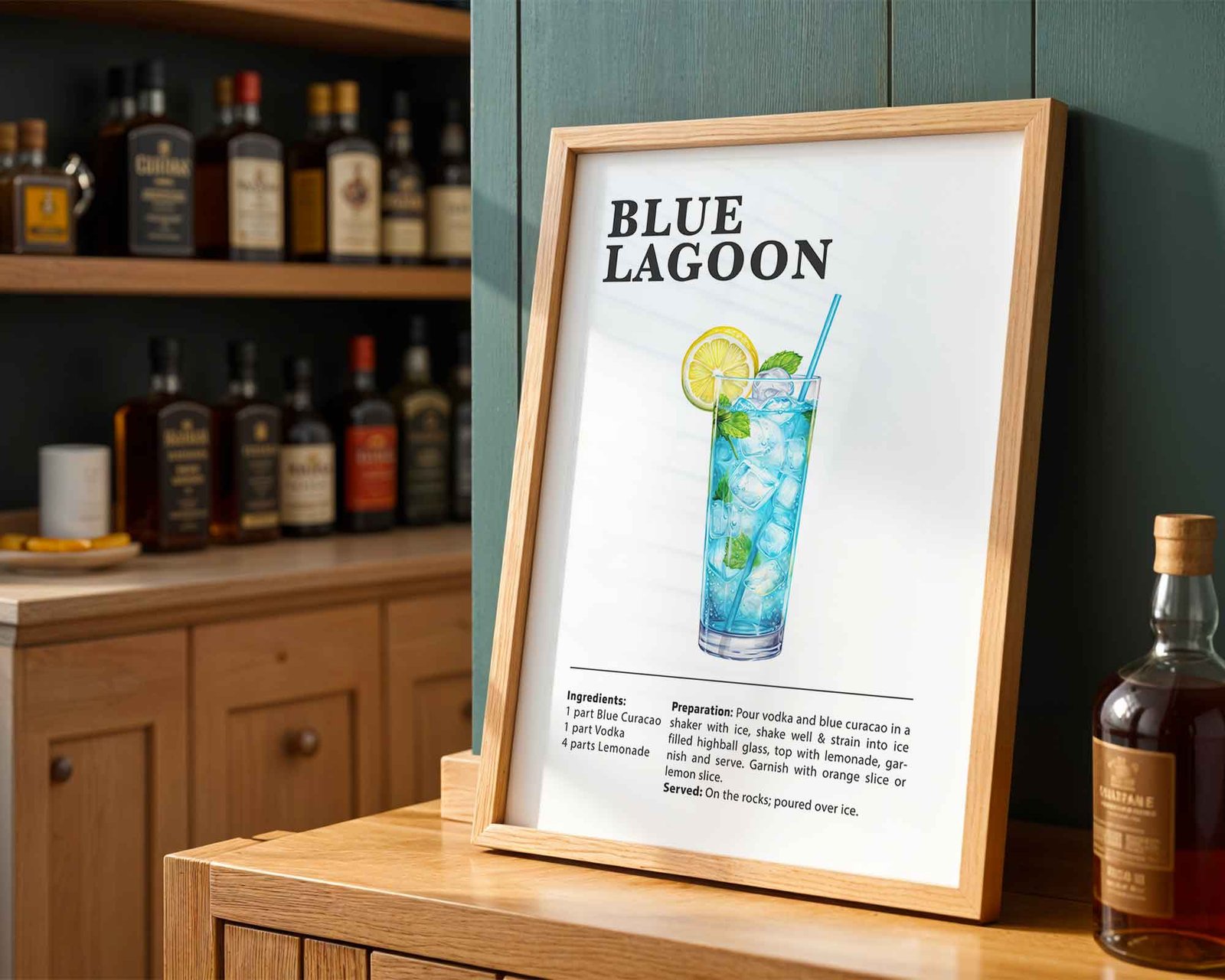 Minimalist Blue Lagoon Poster Print | Illustrated Cocktail Recipe Print | Modern Kitchen and Bar Wall Art Prints
