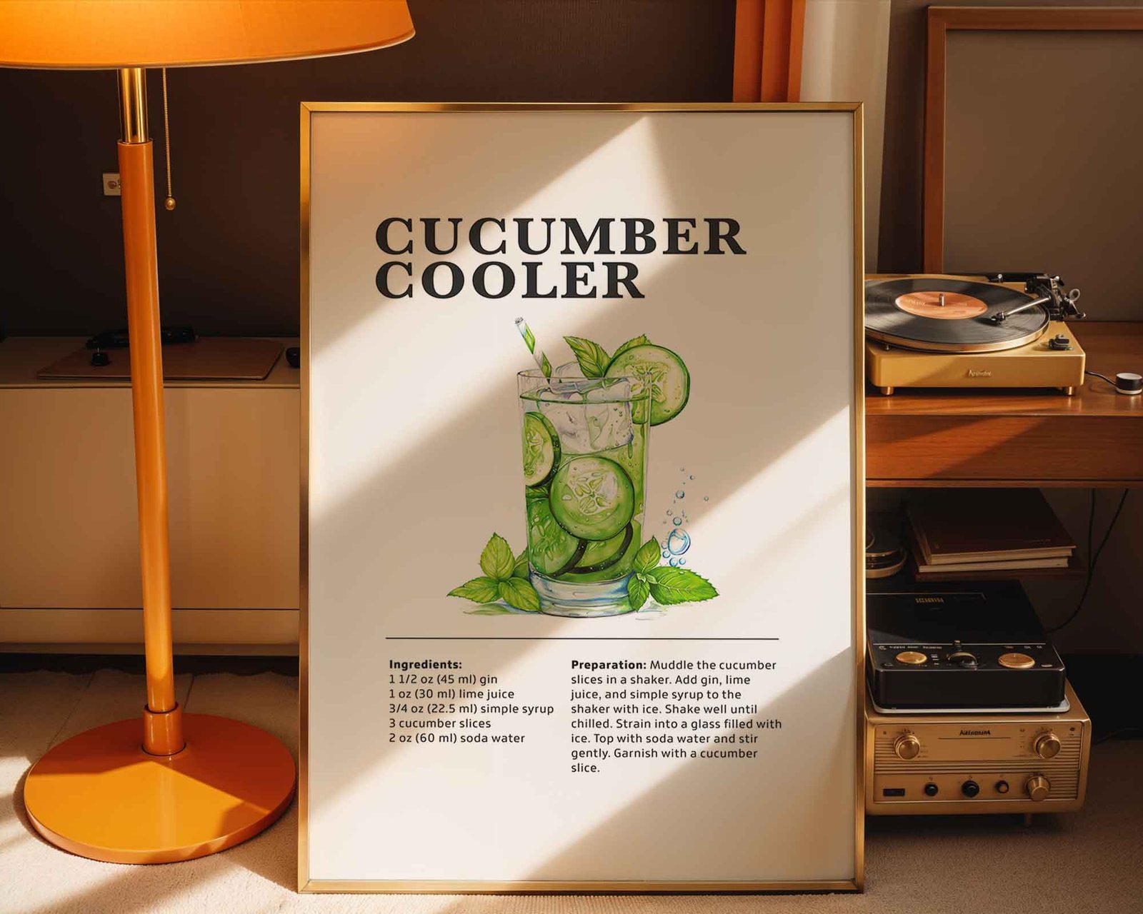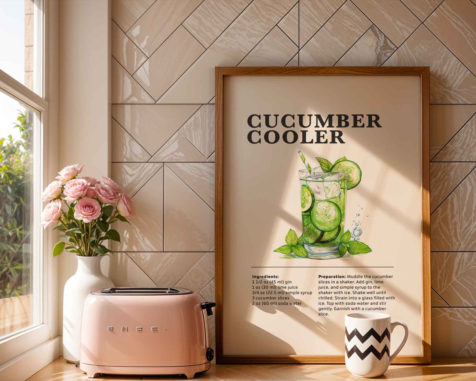 Cucumber Cooler Poster Print | Minimalist Illustrated Cocktail Recipe Print | Modern Kitchen & Bar Wall Art Prints