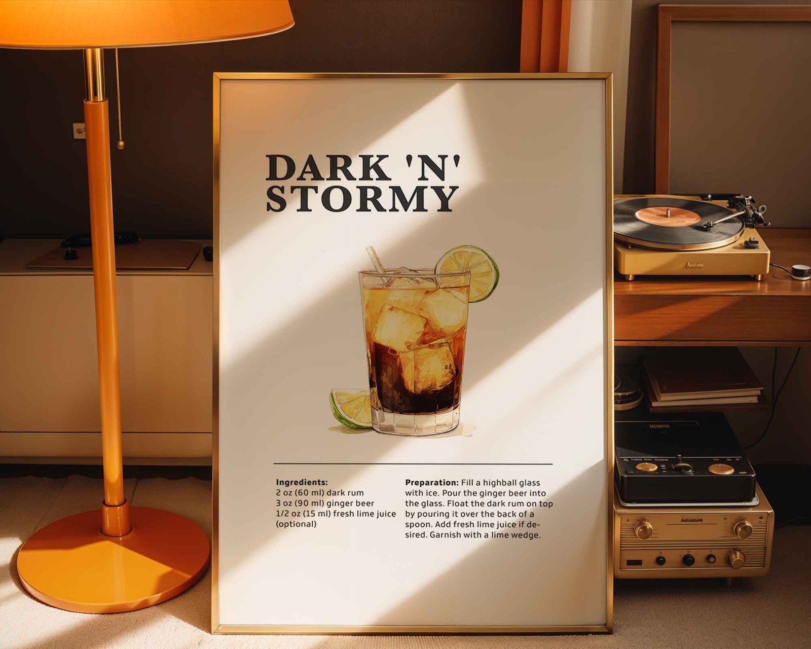 Classic Dark N Stormy Recipe Wall Art | Illustrated Cocktail Poster for Home Bar | Kitchen & Bar Cart Decor Poster Print