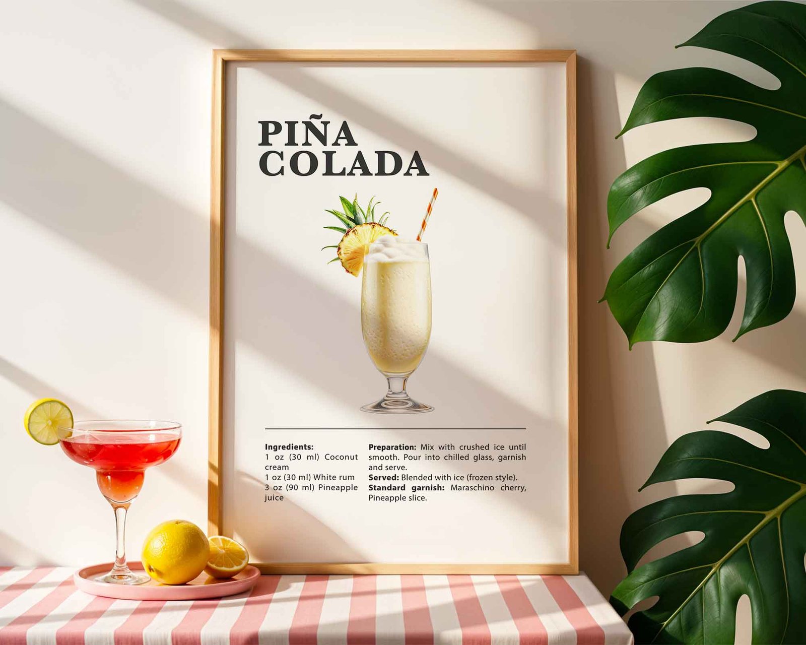 Classic Pina Colada Cocktail Recipe Wall Art | Illustrated Cocktail Poster for Home Bar | Kitchen & Bar Cart Decor Poster Print