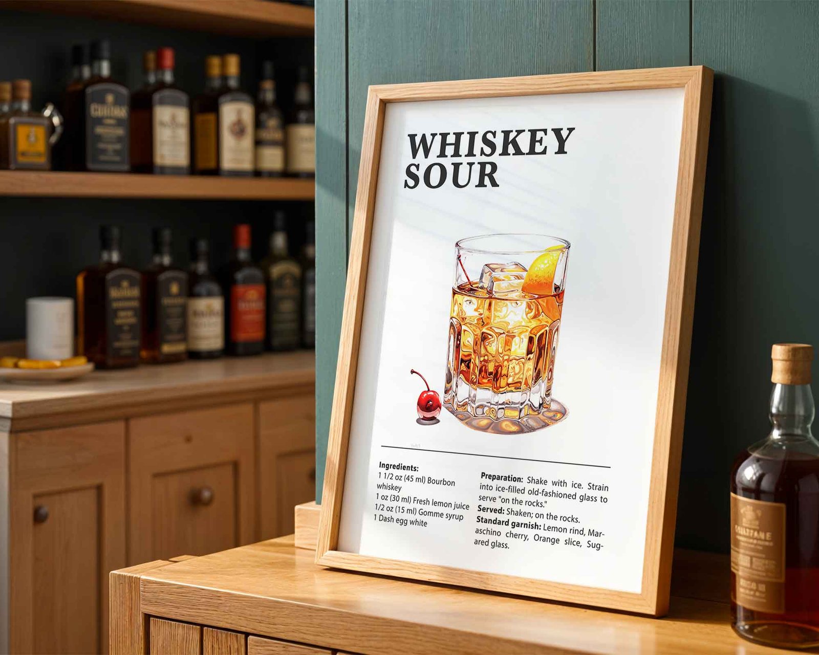 Classic Whiskey Sour Cocktail Recipe Wall Art | Illustrated Cocktail Poster for Home Bar | Kitchen & Bar Cart Decor Poster Print
