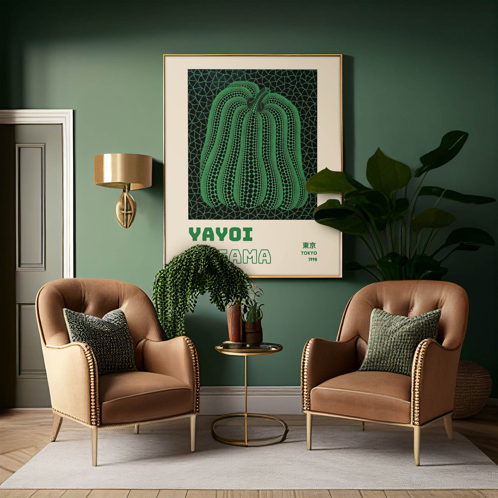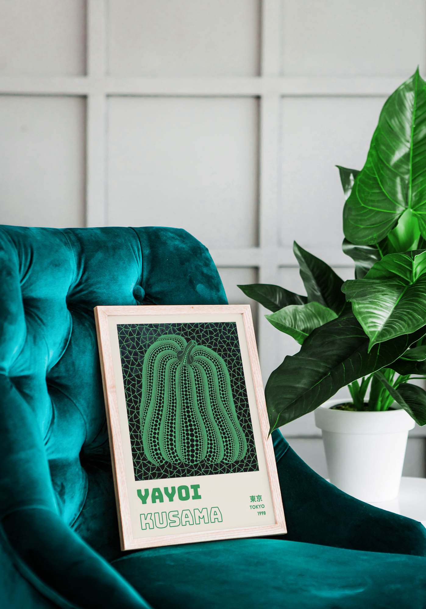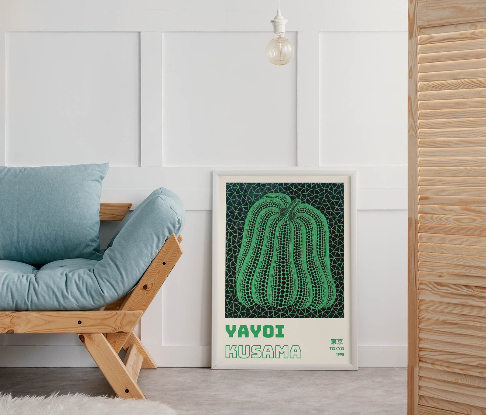Green Pumpkin Yayoi Kusama Tokyo 1998 Exhibition Poster Print | Green Polka Dot Pumpkin & Infinity Net | Contemporary Japanese Wall Art